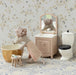 A toilet is added to the bathroom assortment. It is beautifully made in an off-white color with a black seat. Seat can open and close, and a pull function in the handle makes it very real and playful. It is perfect in size for the mouse family.